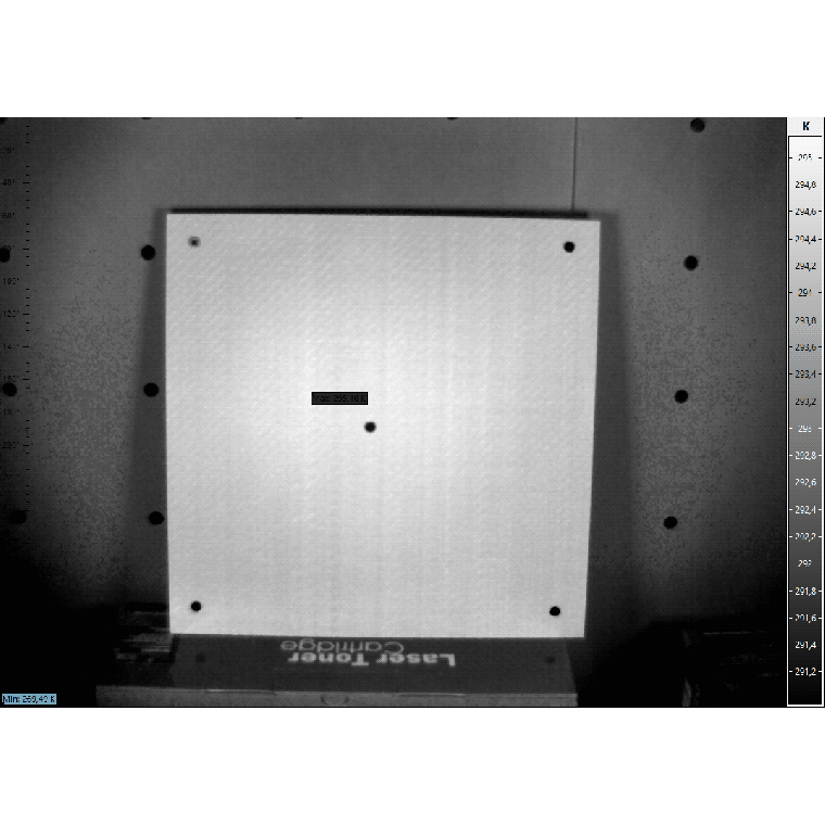 Hierbei handelt es sich um eine Carbon Platte. Im Hintergrund befinden sich unterschiedliche Bohrungen (linkes Bild)mit verschiedenen Durchmessern. Mittels ansteuern zweier Blitzleuchten und zum geeigneten Zeitpunkt der Thermografie - Messung wurden alle Bohrungen ersichtlich. ( Klicken Sie auf das Bild und es erscheint Ablaufbild (Gif))