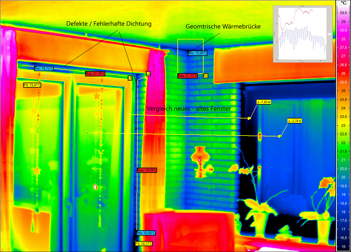 Nur mit Hilfe der Innenthermografie können gefährdete Zonen (Schimmelbildung durch Tauwasser) erkannt werden.